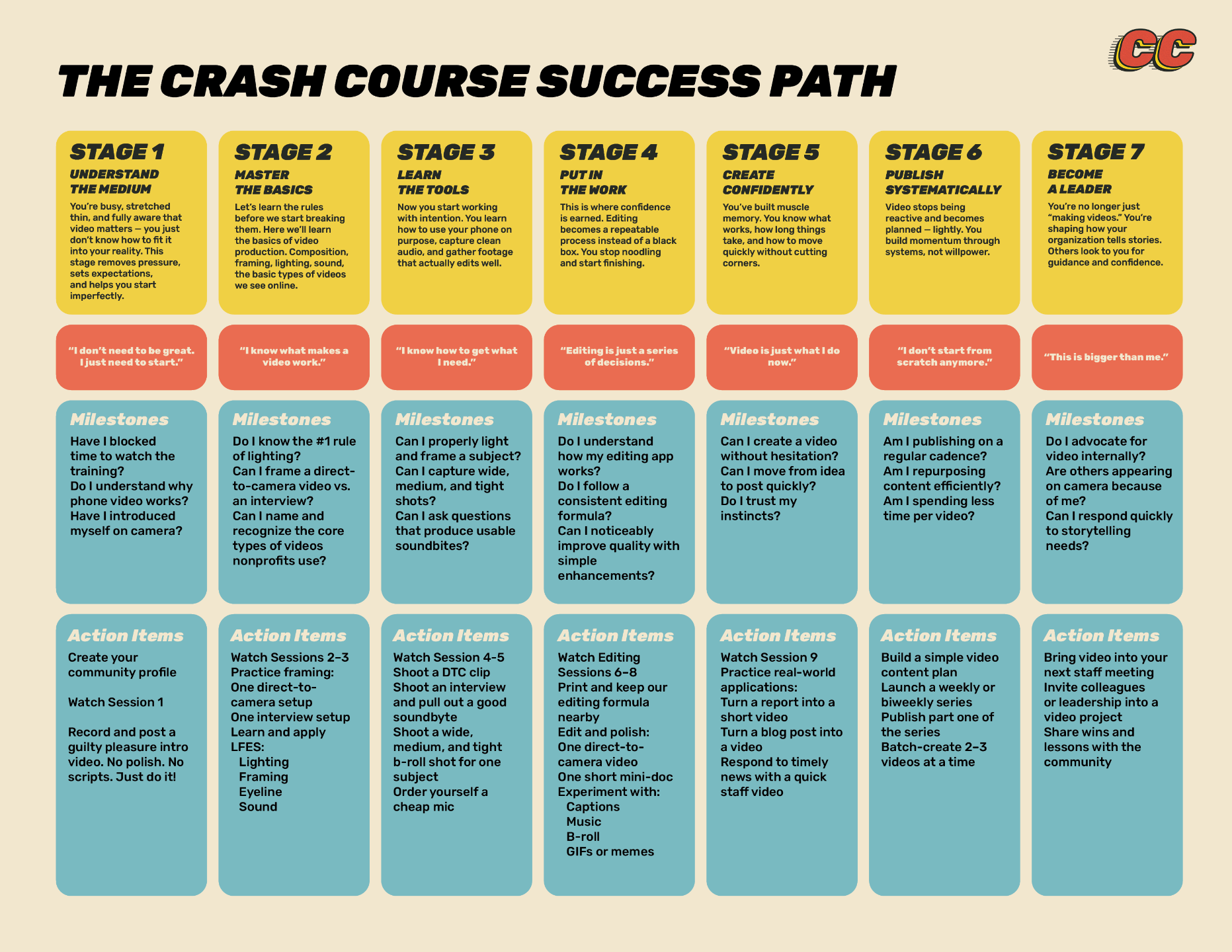 And what if I said you could do all of that for a FRACTION of the cost of even one professionally-produced video? When you sign up for a Crash Course membership, you'll not only learn all the technical skills for creating great videos, you'll get content ideas, updates on the constantly-changing tech, and a supportive community that is learning right along with you.Â